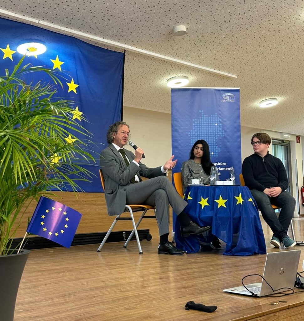Nach einer erholsamen Nacht im Hotel Hohenstaufen in Koblenz starteten wir in den zweiten Teil der Veranstaltung, der für die Juniorbotschafterin Tuba Gujjar von der ASS besonders aufregend war. Sie war nämlich im Vorfeld, gemeinsam mit Finn aus Saarlouis, aus einer Gruppe von Interessenten für die Moderation des Abgeordnetengesprächs ausgewählt worden. Zu diesem war der Europaabgeordnete Dr. Joachim Streit (Freie Wähler, Fraktion: Renew Europe) eingeladen worden. Nach einer kurzen Vorstellung des Juristen, ehemaligen Landrats und aktuellen Mitglieds des Europäischen Parlaments leiteten Tuba und Finn mit ihren Eröffnungsfragen die Diskussion ein. In der Folge sorgten sie dafür, dass alle Meldungen aus dem Publikum der Jubos und Sebos berücksichtigt wurden und alle Schüler/-innen ihre Fragen an Herrn Dr. Streit loswerden konnten. Diese Fragen betrafen u.a. die Themen Klimaschutz und erneuerbare Energien, Klimamigration, die europäische Sicherheitspolitik und die von Friedrich Merz ausgehende „Stadtbild-Debatte“. Joachim Streit nahm sich 90 Minuten Zeit für die Schüler/-innen und ging auf alle Fragen ein. Die Jubos und Sebos der ASS waren sich aber in ihrem internen Austausch nach der Diskussion darüber einig, dass es bei manchen Antworten von Herrn Dr. Streit interessant gewesen wäre, wenn eine Rückfrage oder andere Sichtweise aus dem Publikum Raum bekommen hätten. So blieb es – dem Format der Podiumsdiskussion geschuldet – doch eher bei einem „Frage-Antwort-Ping-Pong“.
