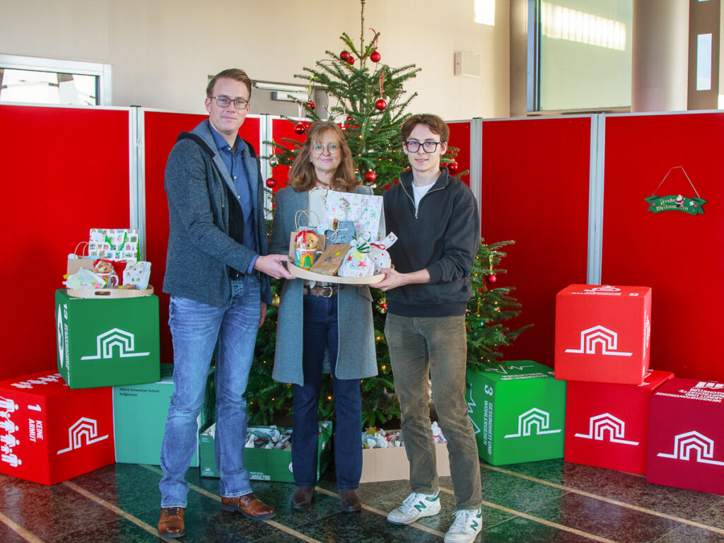Anfang Dezember wurden die Geschenktüten dann in der Albert-Schweitzer-Schule von einigen Schülerinnen und Schülern gemeinsam mit dem Schulleiter, Herrn Sauerwein, an Frau Landgrebe von der Hofgeismarer Tafel übergeben.